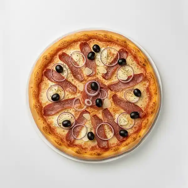 Tomatensauce, Mozzarella, Speck, Oliven, Zwiebeln, Knoblauch, Oregano